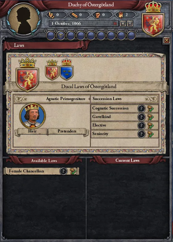 Скриншот текущего интерфейса законов в игре. На этом скриншоте представлено что наследником герцогства станет сам король, поскольку других наследников у юного правителя еще нет. Претендентами называются вторые и третьи в линии наследования люди.