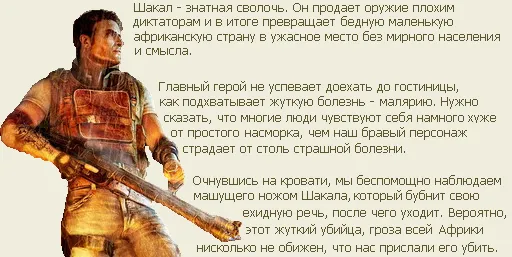 В начале вы выбираете одного из нескольких персонажей. Это внушает интерес и по идее должно показывать нам разные истории. Но на деле завязка одна и та же: вы в роли наемника приезжаете в африканскую страну, чтобы убить продавца оружием по имени Шакал. Я не могу судить авторитетно - игру прошел далеко не полностью, но, кажется, персонажи СОВЕРШЕННО ничем друг от друга не отличаются.