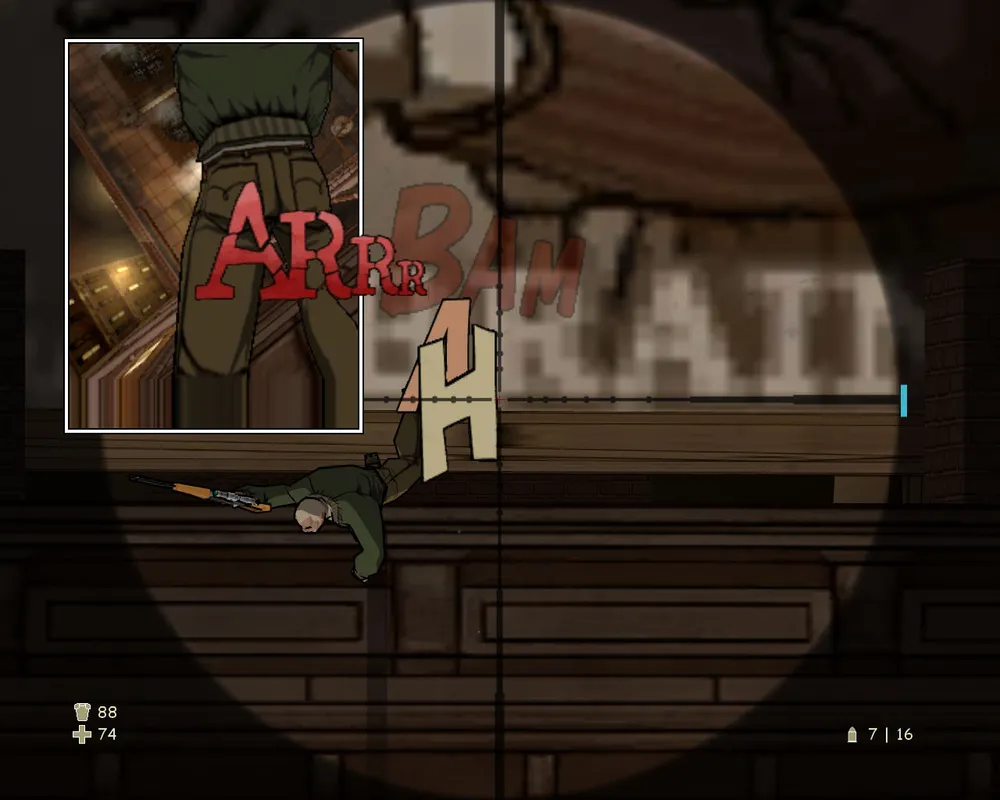 И в-третьих - для создания *эффекта комикса* использовались изобразительные слова (или ономатопея). Например, при взрыве гранаты появляется комичная надпись Boom!, при падении врага с большой высоты - Aaaaaarrrgggggghhhh и так далее. Главное, что такой подход к делу еще больше погружает игрока в созданный Жаном Ван Хаммой и Вильямом Венсом мир (авторов оригинального комикса 1984 года о похождениях Тринадцатого).