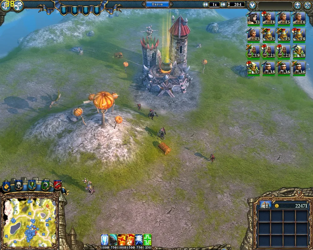 Тем временем город будет подвергаться массированным атакам со всех сторон, но самые опасные из атакующих – минотавры, поэтому необходимо быстро обнаружить и уничтожить их пирамиды. Золота не слишком много, и повышать уровень замка пока не стоит, зато совершенно необходимо построить гильдию послушниц. Нельзя оставлять без внимания порталы гоблинов, периодически возникающие вокруг и в самом городе.