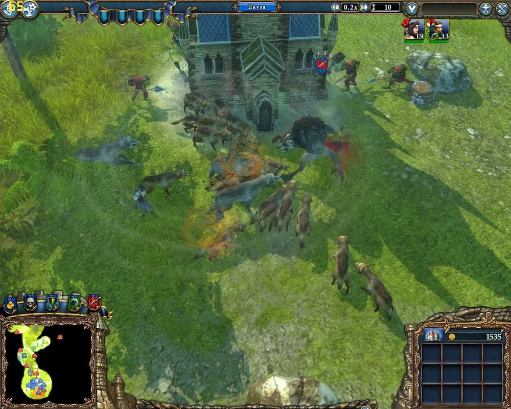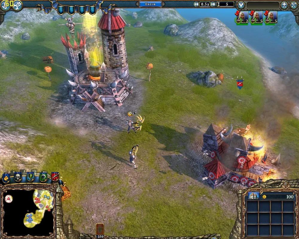 Следующая задача – построить поселение гномов и окружить город их башнями. Как только это будет выполнено – можно считать, что победа у нас в кармане. Атаками или заклинаниями очищаем территорию и добираемся до шамана. Словно в насмешку, после его уничтожения всем героям поднимут уровни – а зачем они теперь, когда миссия практически закончена?