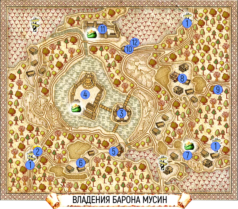 1 – переход на карту мира. 2 – трактир (конюшня). 3 – форт. 4 – замок барона Мусин. 5 – сгоревший особняк. 6 – деревня Околотки. 7 – деревня Большие Смердуны. 8 – деревня Малые Смердуны. 9 – лагерь разбойников. 10 – дом зажиточного крестьянина. 11 – северный гарнизон. 12 – охотничий домик.
