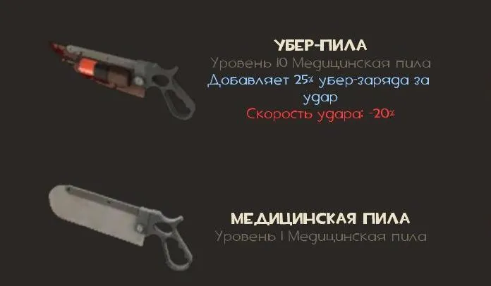 Пилы служат оружием ближнего боя. Убер-пила бьет чуть медленнее, но позволяет быстрее накапливать убер-заряд путем успешных нанесений тяжких телесных противнику.