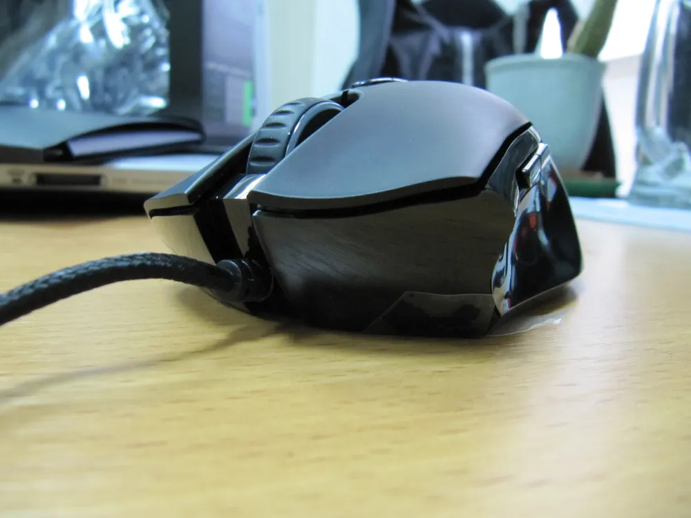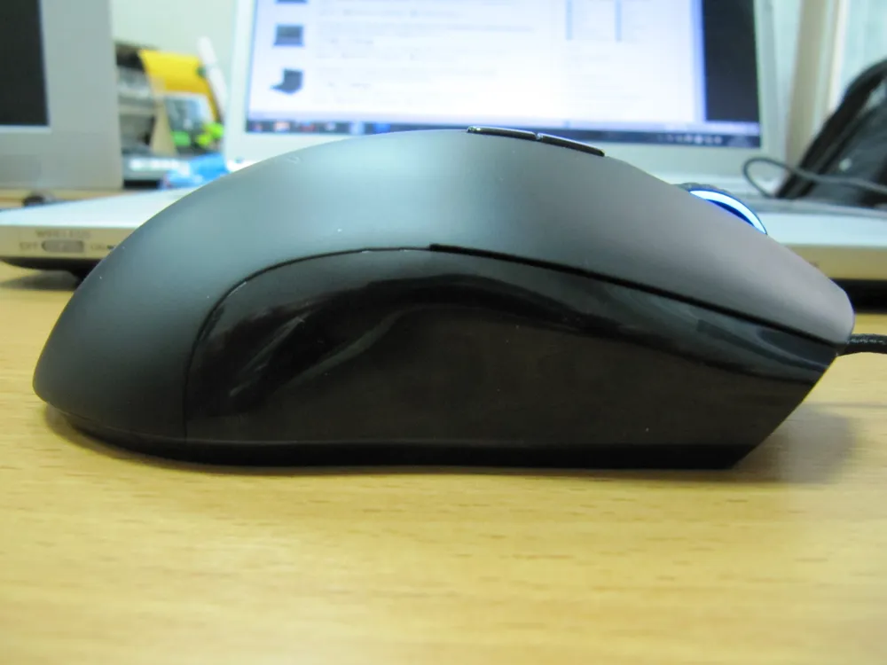 Что мне еще понравилось, продолжая тему эргономики, так это глянцевая поверхность под большим пальцем. Можете считать меня фантазером, но я считаю, что она там сделана не только ради пущей эффектности, а еще и для толики удобства: гораздо легче скользнуть пальцем к боковым кнопкам из выреза под большой палец, чем пробираться через «наждачку» матового покрытия мыши на других ее частях.
