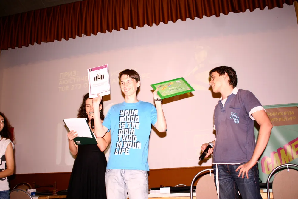 Объявить победителя в этой номинации выпала честь Николаю Борзову, PR-менеджеру Panzar Studio, который в миг перевоплотился в меня и попросил подняться на сцену самого балагуристого и хулиганистого - Митька Алешкина ака @LaCTuk, прихватившего с собой сертификат на акустическую систему TDE 273!