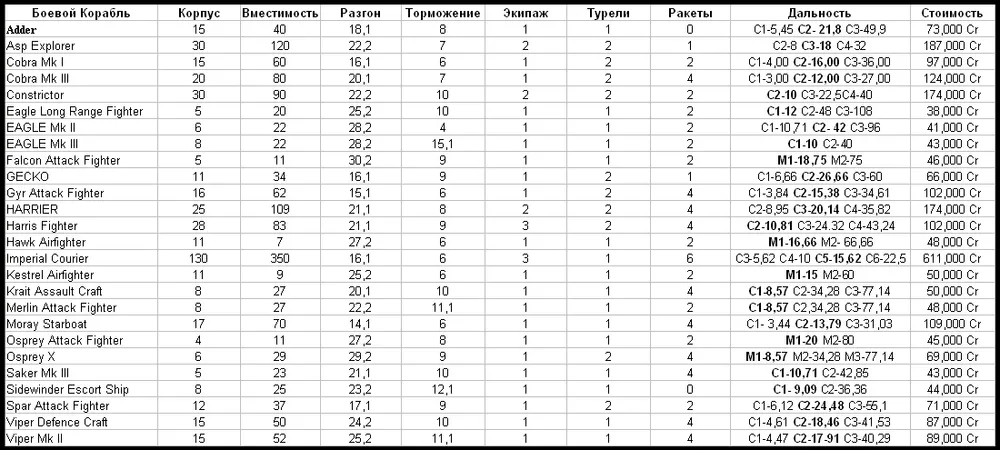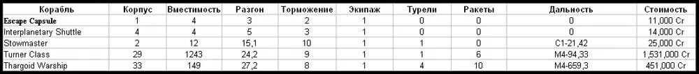 Немного помучившись, составил таблицы ТТХ. Корабли разделены по классам - боевые, торговые и... не поддающиеся классификации =) Можно распечатать все это дело в альбомной развертке и пользоваться на здоровье.