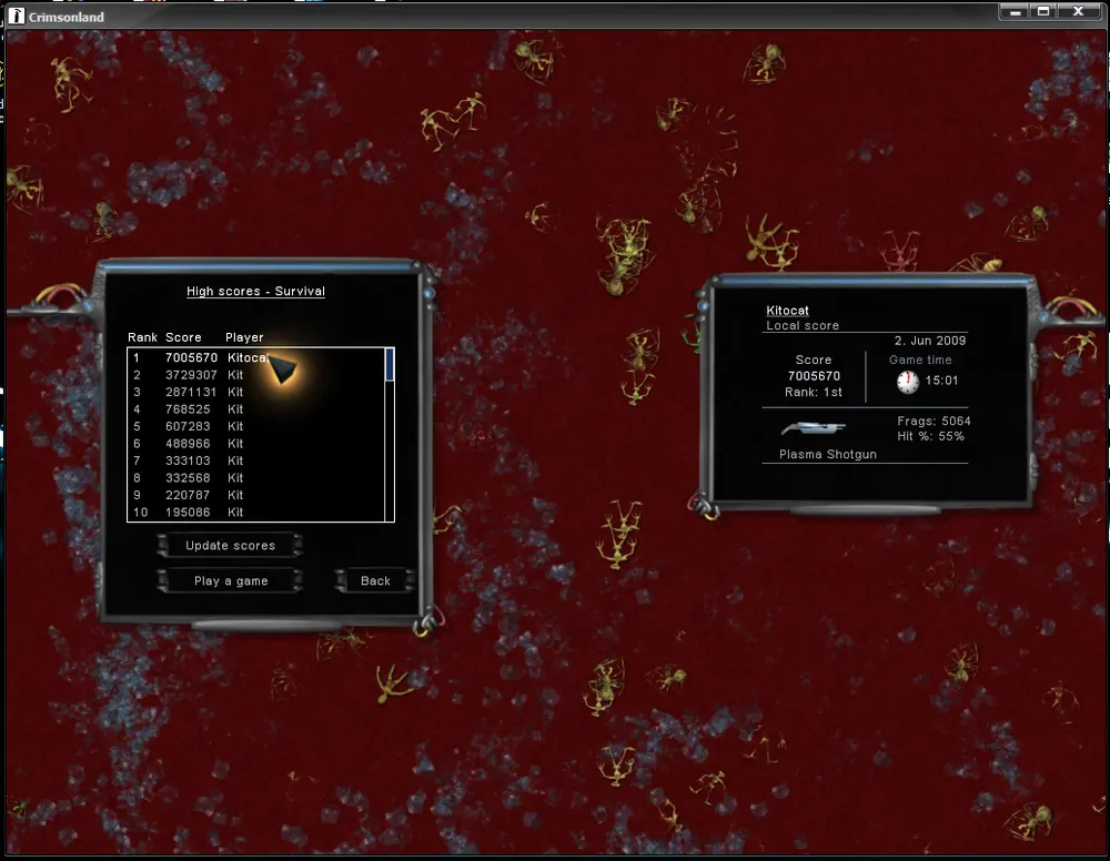 Родилась у меня идея, а почему бы не провести турнир по Crimsoland'у? Игровой процесс незамысловатый, игра, должно быть, много у кого есть, а если у кого-то нет, но идея заинтересует, то скачать каждый сможет - благо, что занимает всего 10мб. Соревнуемся сегодня. Категория - Survival. Играем партию, затем делаем скрин экрана с рекордной таблицей :)