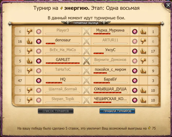Вы можете принять участие в турнирах через кнопку «Турниры» в здании «Арена»