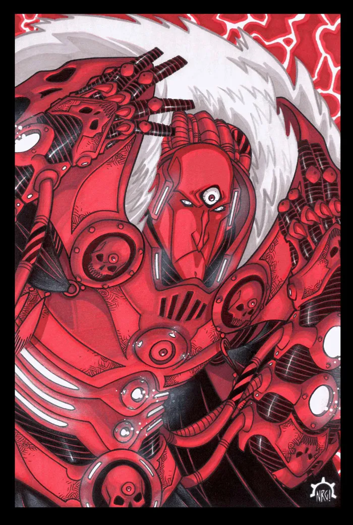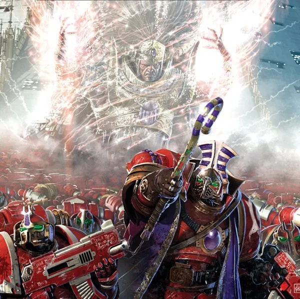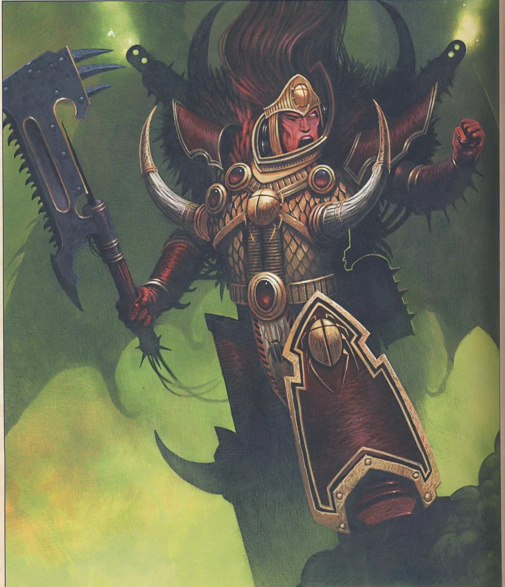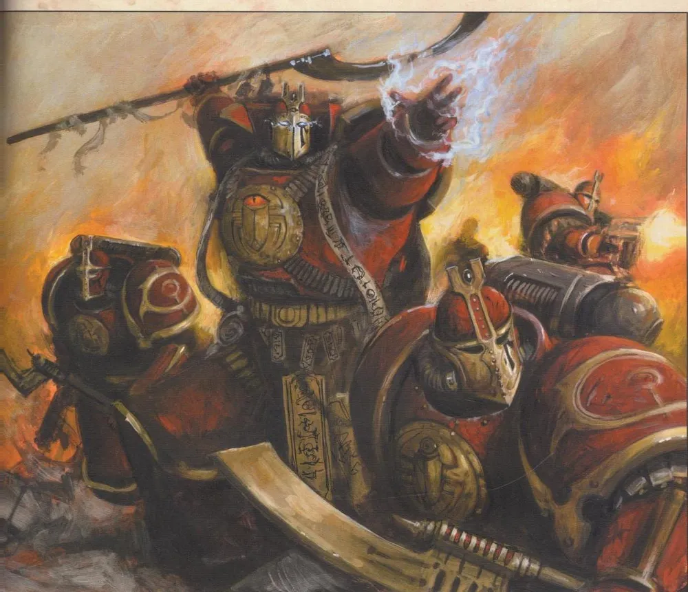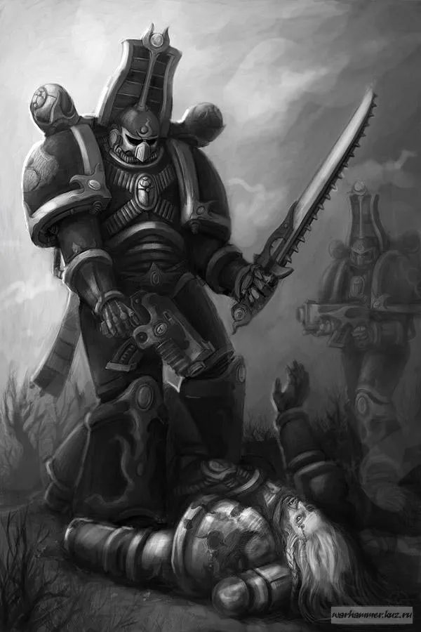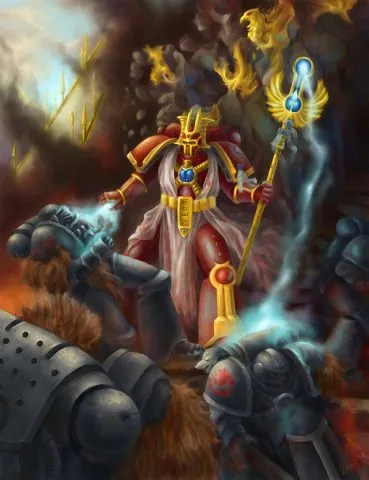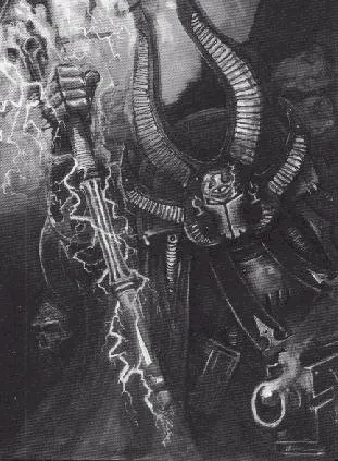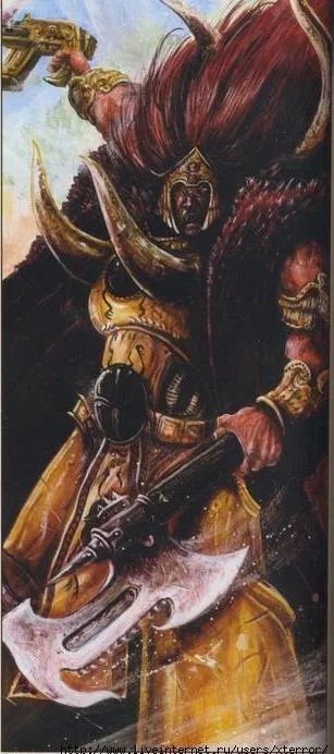 На этом рисунке изображён Фозис Т’Кар – капитан Второго Содружества, глава культа телекинетиков – Раптора. Очень мощный господин, кстати. Выдержать на своём щите два выстрела из орудия эльдарского титана – это не фунт изюма слопать. Его доспехи и оружие выглядят вполне характерно для капитана Тысячи Сынов: богато украшенная золотом алая броня, крупные изображения скарабеев, аналог пси-капюшона, две ленты, подобные печатям чистоты у других орденов космодесанта, но изукрашенные магическими символами, мастерски сделанный болтер и рунный меч-хопеш, лезвие которого служит для проецирования энергии Искажения в виде разрушительных разрядов.