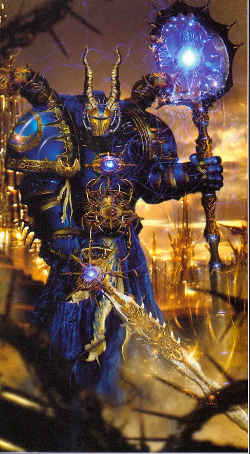 Магнус – единственный из примархов, который после принятия демонической сути не слишком сильно изменился внешне. Или же изменился кардинально – тут уже зависит исключительно от его собственного желания. Его физическое тело было уничтожено Руссом на Просперо, но великому магу это не слишком повредило – перенёсшись на Планету Колдунов, он обрёл новое тело, состоящее из чистой энергии Искажения. Теперь он мог менять свой внешний вид практически как угодно, а магическая сила возросла неимоверно. Правда, со временем эйфория от открывшихся перед ним практически беспредельных возможностей прошла, и Магнус ясно осознал, что теперь он уже не является полновластным хозяином – ни своей магии, ни даже своего тела…