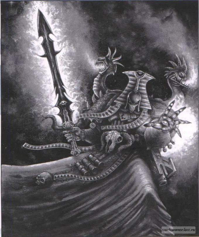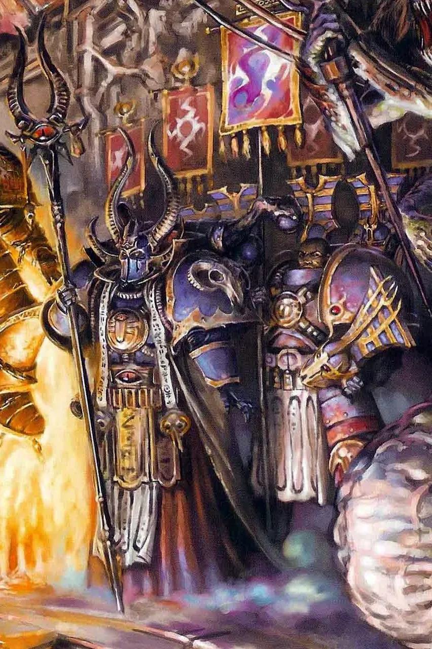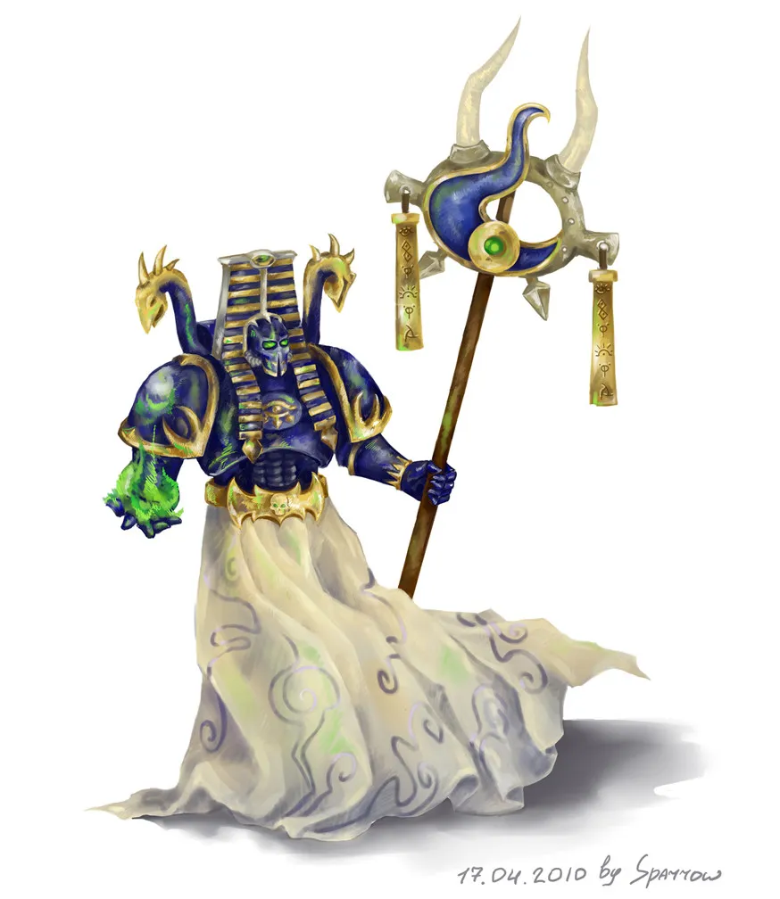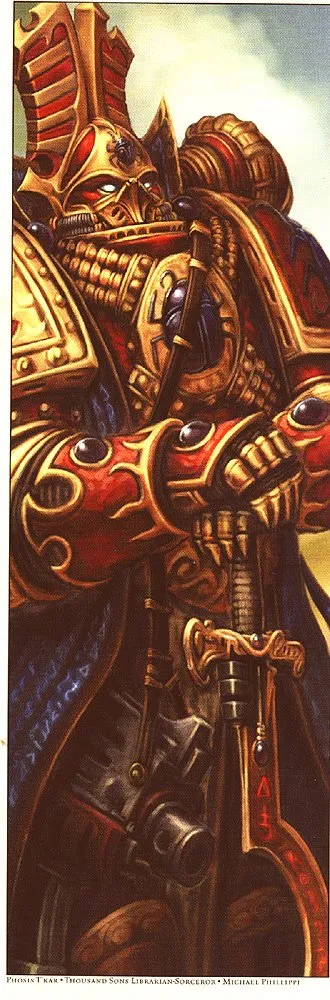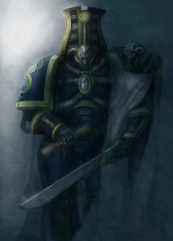 А на этом рисунке изображён никто иной как сам Ариман – глава культа провидцев-Корвида и главный библиарий Тысячи Сынов. На правом наплечнике изображён знак его школы – глаз. Это практиковалось для всех магов легиона. Легко заметить, что доспех Аримана в целом похож на броню Фозиса Т’Кара, но ленты белые с чёрными символами, а скарабей на груди золотой и «зрячий» - именно по этим признакам проще всего различать высших магов культов Тысячи. Ещё один важный момент – количество украшений в виде скарабеев. Дело в том, что Ариман был ещё и главой Мистических Скарабеев – терминаторов Тысячи Сынов. В руках у него не меч, а посох хека (аналог реально существовашего оружия, посох с серпообразным лезвием на конце) – также, как и хопеш Фозиса, применяющийся в основном для концентрации магической энергии владельца с последующим прожариванием врага до хрустящей корочки. Хотя при необходимости им и отрубить можно что-нибудь ненужное…