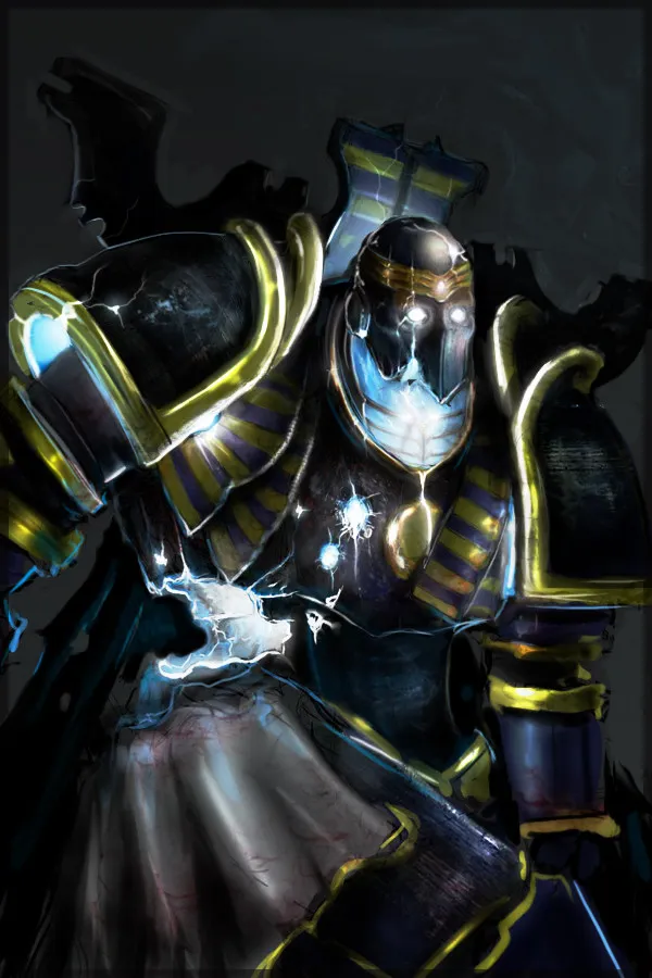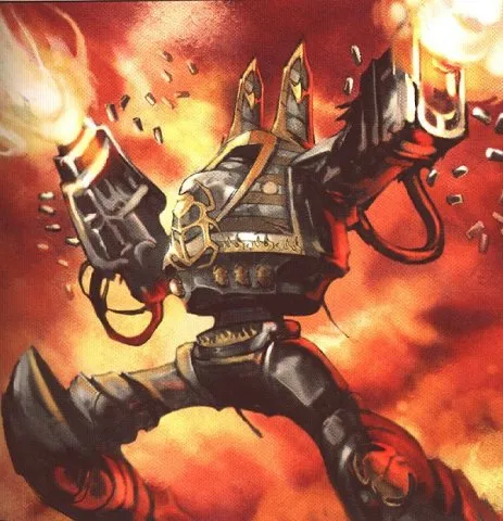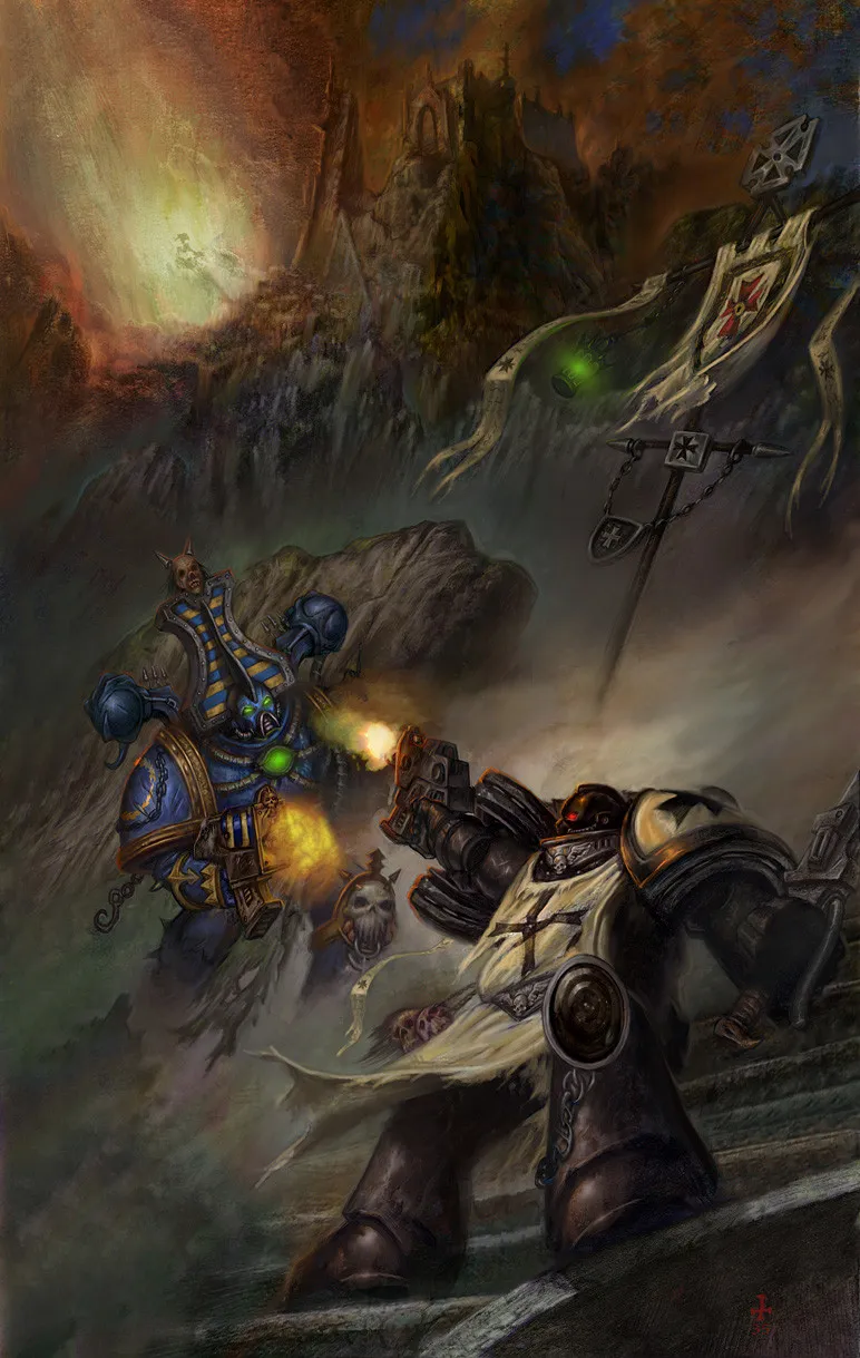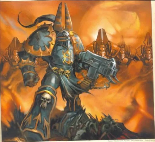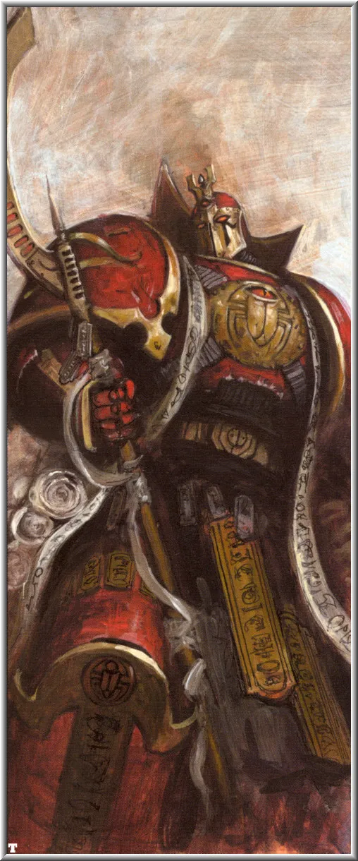 На этом рисунке мы опять видим Аримана, но на сей раз он окружён Мистическими Скарабеями – элитнейшими воинами Тысячи. Этих терминаторов собирали из лучших воинов-магов всех культов легиона, одинаково хорошо владеющих и классическим военным искусством, и боевой магией. Они жили только войной, для войны и ни для чего более. Идеальные машины разрушения, руководствующиеся исключительно логикой и тактическим мышлением, давно утратившие все человеческие чувства, такие как страх и жалость. «Ягатай-хан назвал их автоматами, Русс раскритиковал их за отсутствие боевой ярости, а Феррус Манус сравнил с роботами. Зная о повелителе Железных Рук по рассказам своего примарха, Ариман подозревал, что последний комментарий был комплиментом.» (перевод отрывка из книги «A Thousand Sons») Сам же Ариман при виде Мистических Скарабеев вспоминал древнюю легенду о големе. Учитывая будущие события, довольно зловещее получилось совпадение…