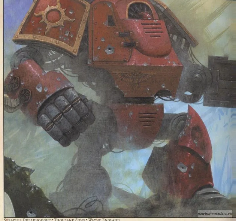После Ереси дредноутов у Тысячи не сильно прибавилось. Однако те, что уже есть и иногда всё же появляются, являются воистину страшным оружием – пронизанные силами Искажения и в большинстве своём являющиеся магами, они внушают ужас в сердца врагов одним своим видом.