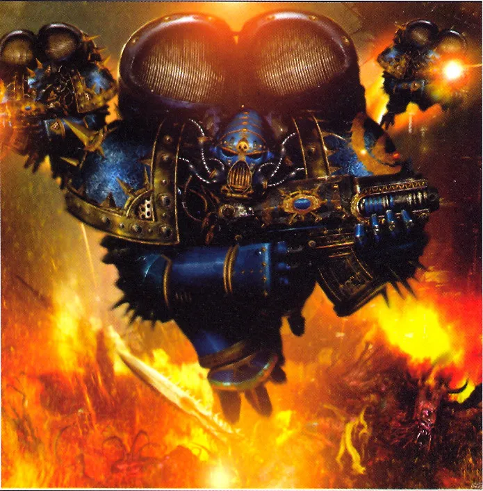 После Ереси и рокового Разделения Аримана и этот аспект тактики Тысячи Сыновей был возведён в абсолют благодаря двум моментам: усилению магов легиона и появлению так называемых «десантников разделения». Ну, первое-то понятно, а вот со вторым надо разобраться подробнее. Из-за Разделения большинство десантников Тысячи – те, кто не обладал магическими способностями – превратились в големов. Их тела обратились в прах, а души навек оказались заключены внутри брони. Это привело не к самым приятным последствиям для их разумов – проще говоря, мозгов у них теперь не больше, чем у каких-нибудь дистанционно управляемых боевых роботов. Однако у такого состояния есть и плюсы – как боевые единицы десантники Разделения великолепны. Не испытывают боли и страха, почти неуязвимы, очень сильны и точны. Единственная проблема – для того, чтобы они были способны на хоть сколько-то сложные манёвры, их действиями должен руководить колдун. В результате основными тактическими единицами теперь стали отряды десантников Разделения, управляемые несколькими магами. Как и раньше, основной упор в бою делается на дальнобойное оружие и магию, только теперь десантников гораздо сложнее убить и благодаря этому маги отряда могут больше внимания уделять испепелению врагов, а не защите големов.