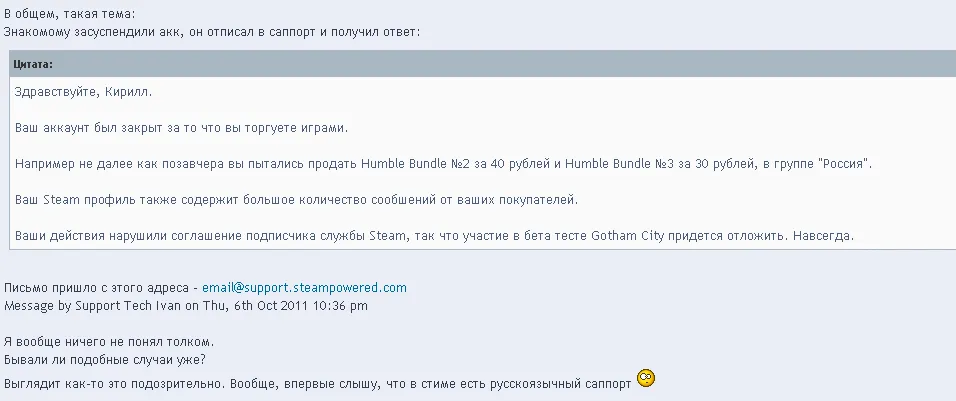 Введение же русской поддержки в Steam радует, но если верить вот этому письму из темы про бан за торговлю, то вряд ли можно сказать, что в данный момент в отделе работают люди, хорошо владеющие русской орфографией: