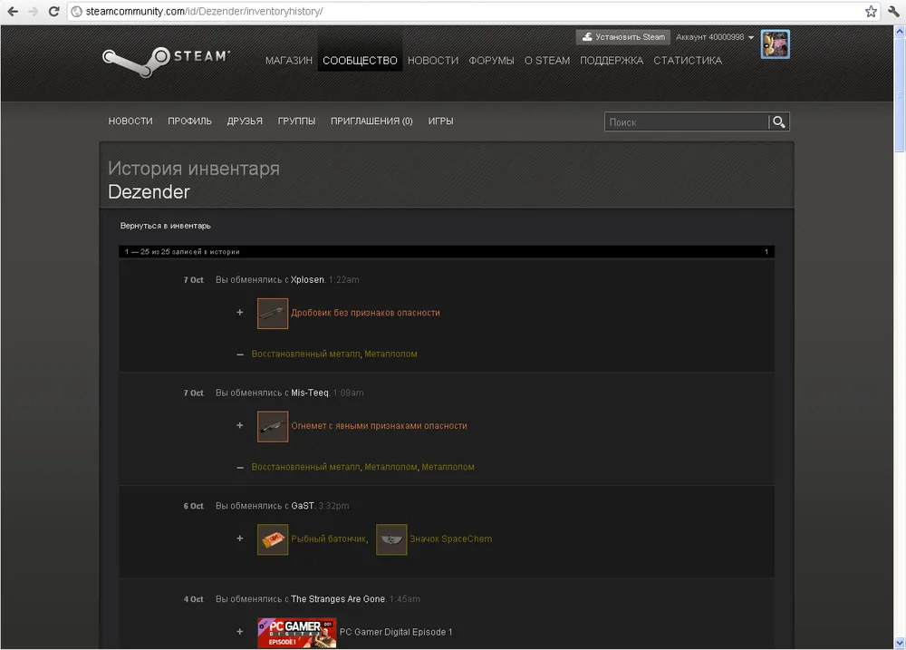 2. Теперь доступна для просмотра история сделок(торговли) на любом аккаунте.Свою историю можно узнать, пройдя ссылке: http://steamcommunity.com/id/{имя или ID аккаунта}/inventoryhistory/: