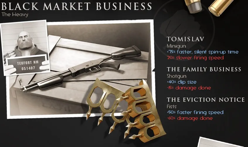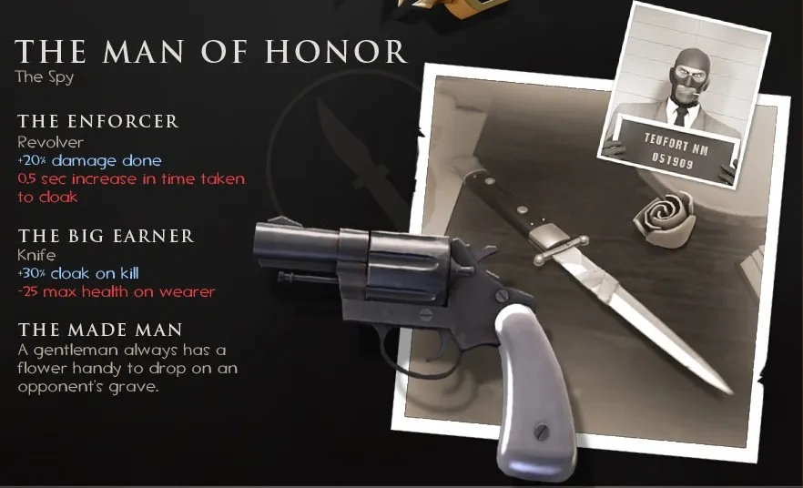 Шпион получит револьвер Жестокий преступник, который наносит на 20% больше урона по сравнению с обычным револьвером, но в невидимость вы будете уходить на 0,5 секунды дольше. Еще одно оружие — нож Большой заработок, отнимающий 25 очков здоровья при экипировке, но при каждом убийстве врага дающий шпиону аж 30% заряда невидимости. Не забыли и важной шляпке Мафиози.