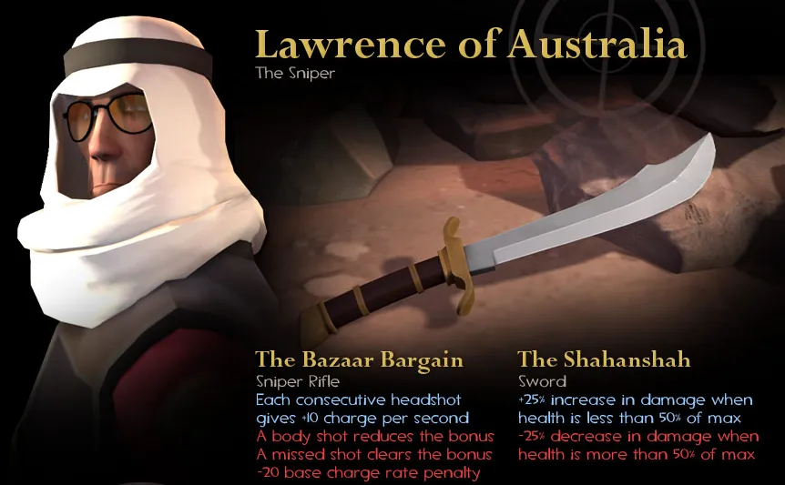 У снайпера появится куфия Лоренс Австралийский,винтовка Базарная безделушка (за каждое попадание в голову заряд будет накапливаться быстрее, если промахнетесь — бонус аннулируется, попадете в тело — отрицательный бонус к скорости накопления заряда).