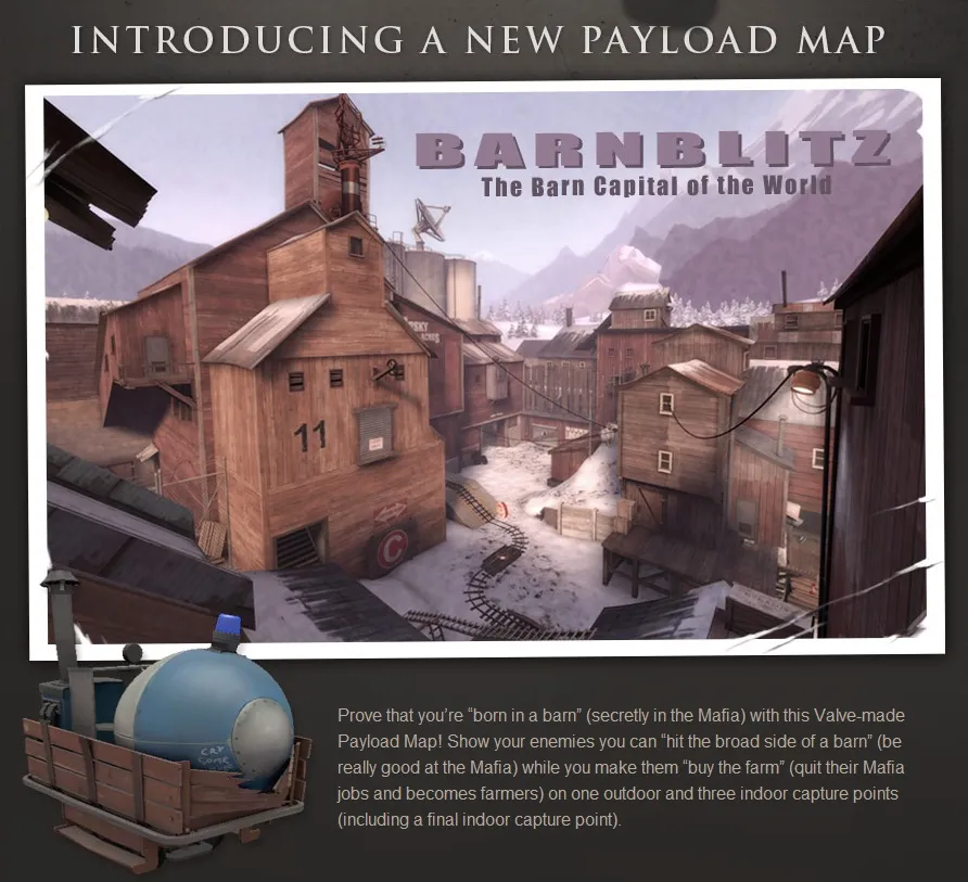 Докажите, что Вы “родились в сарае” (тайно в Мафии) с этой сделанной Valve картой режима Payload! Покажите Вашим врагам, что Вы можете “поразить широкую сторону сарая” (быть действительно хорошим в Мафии), в то время как Вы заставляете их “купить ферму” (покиньте Мафию, и стать фермерами) на одной открытой и трех закрытых точках захвата (включая заключительную закрытую точку).