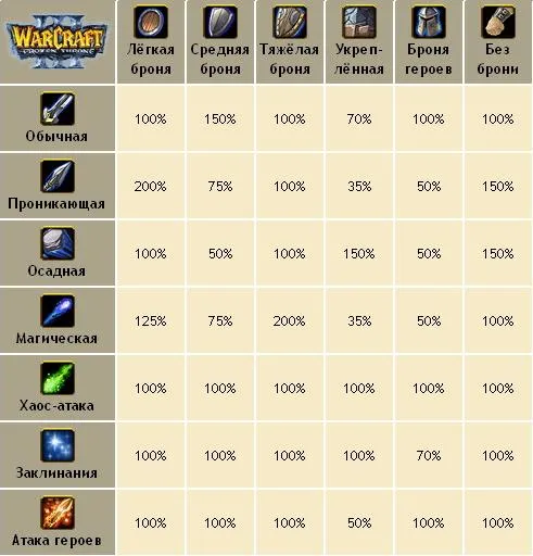 В WarCraft'е есть 7 типов атаки (Обычная, Проникающая, Осадная, Магическая, Хаос-Атака, Заклинания, Атака Героев) и 6 типов брони (Легкая, Средняя, Тяжелая, Укрепленная, Броня Героев, Без брони). Выше предоставлена таблица совокупности всех этих типов. Пользуйтесь ею, это очень полезная вещь. Дальнобойными войсками (в основном это юниты с проникающей атакой) фокусируйте огонь, и старайтесь в первую очередь фокусировать на юнитах с легкой броней и без брони, т.к. они наносят больший урон этим броням (легкой - 200% урона, Без брони - 150%). А войска, предназначенные для ближнего боя (в основном это юниты с обычной атакой) посылайте за спины врагов через клавишу "A", что бы ваши воины не толпились, а бежали указанное место, снося все что не так встанет на их пути.