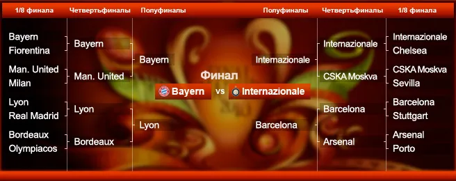 "Бавария" прошла через самых разнообразных противников, таких, как "Фиорентина", которая в этом году крайне мощно выступала в ЛЧ, через "Манчестер Юнайтед", который, к своему несчастью, просто недооценил соперника, и, наконец, через французский "Лион" (который в свое время обыграл "Реал Мадрид", хозяев "финала"), выступивший в полуфинале крайне блекло. У баварцев отмечу превосходного форварда Олича и крайне шустрого Роббена, который сейчас располагает на пике своей формы.