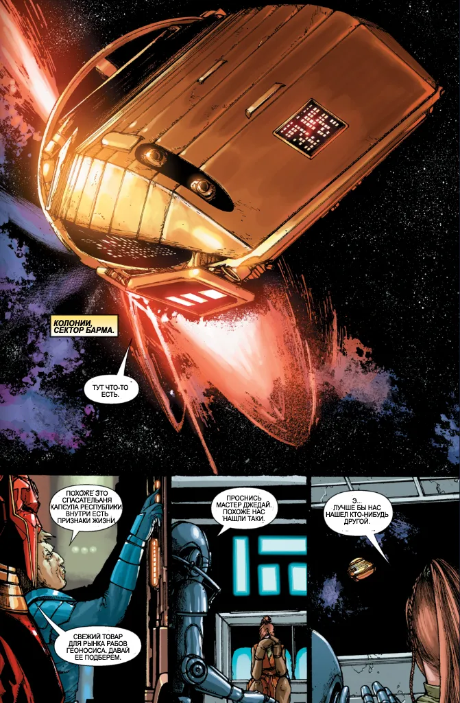 а комикс да, много клише и повторов. например намечающийся повтор из первого котора. Сатель на спасательной капсуле попадает в лапы работорговцев. прям как Бастила.