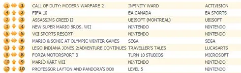 Assassin’s Creed II наоборот немного сдал позиции и переместился на третье. Fifa 10 поднялась на одну ступень выше и занимает теперь второе место. Топ ниже: