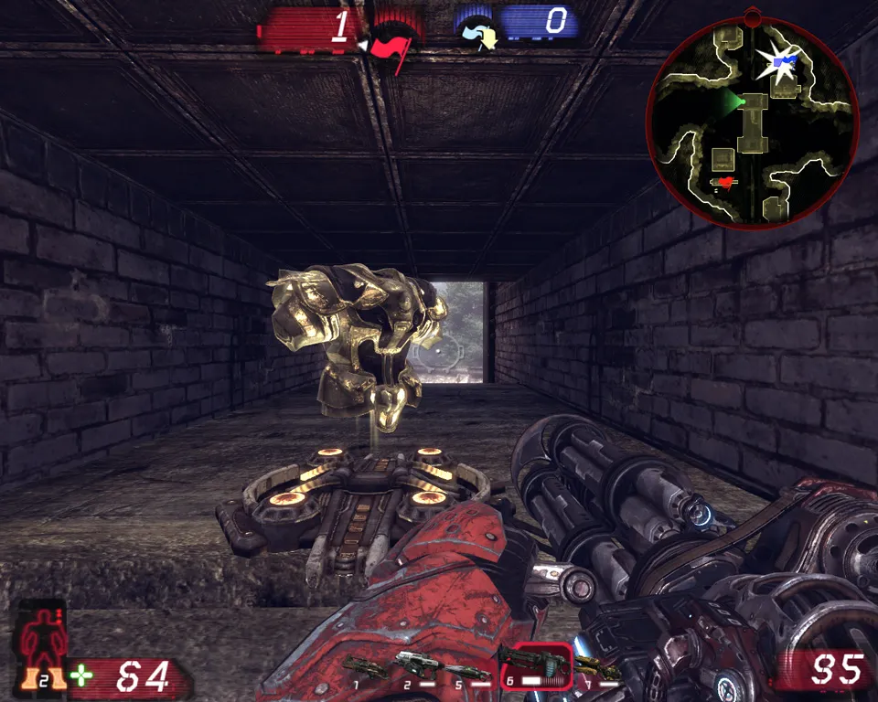 Последними в нашем списке идут улучшения. Начнем двигаться от базы. Поворачиваем назад от столбов — там нас ждут пять ампул здоровья. Выйдя, сворачиваем налево — к «хеллфайеру». Здесь валяется целый бочонок здоровья. Возвращаемся обратно к выходу и теперь поворачиваем направо. Прыгаем на трамплин. Мы вновь у аврила. Берем шесть ампул здоровья и прыгаем вниз, но прижимаемся спиной к стене, так, чтобы не упасть на трамплин. Попадаем в небольшое отверстие в мосту. Здесь лежит бронежилет, а на другой ножке — реактивные ботинки. С их помощью будет проще воровать флаг. Затем направляемся на трамплин и прыгаем по крышам и мосту.