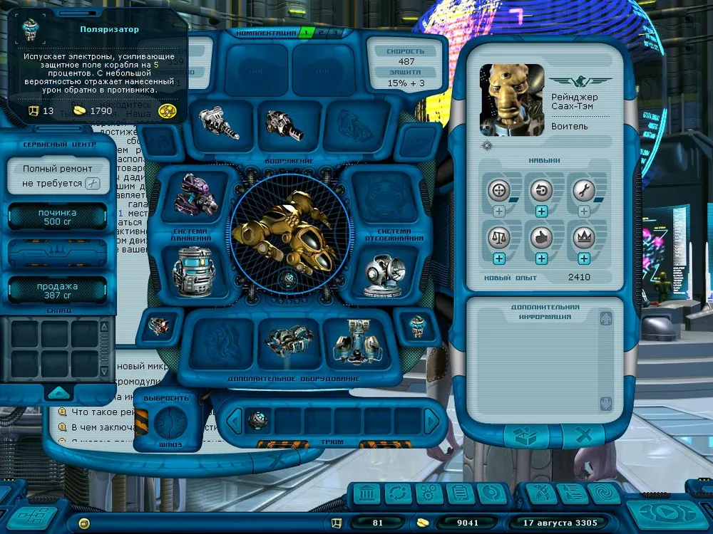 Универсброня корпуса +10, скорость двигателя +70, сила генератора поля +10, починка дроидом +30, дальность радара +800, мощность сканера +10, объем бака +15, мощность захвата +60, сила выстрела энергетического и ракетного оружия +20, осколочного +30корпус, двигатель, топливный бак, сканер, дроид, радар, захват, генератор поля, ракетное оружие, осколочное оружие, энергетическое оружиевсе расы