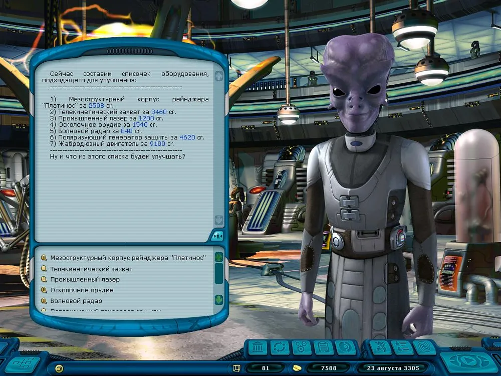 Платиносстоимость оборудования +30%двигатель, бак, радар, сканер, захват, дроид, генератор поля, энергетическое оружие, осколочное оружие, ракетное оружие, корпусвсе расы