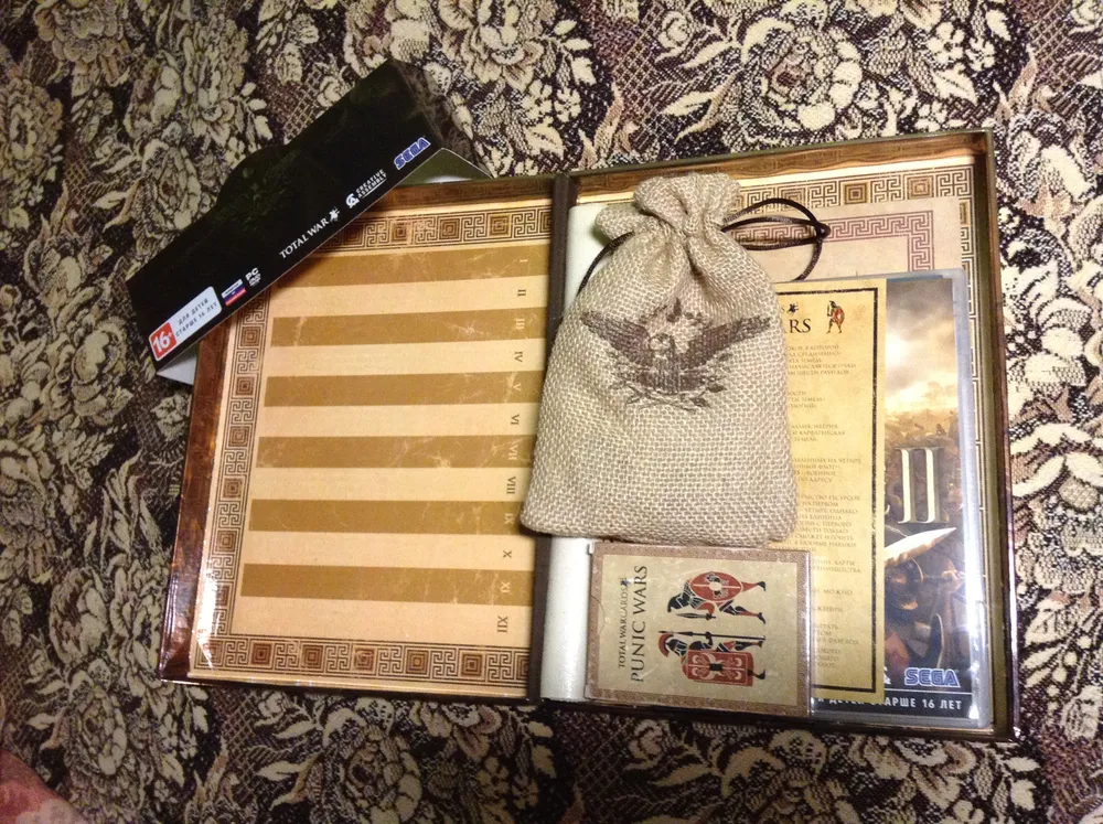 Также в коробке лежал холщовый мешочек с гербом Римской империи. Внутри - кости игральные, фишки интересного вида. Всё как положено.