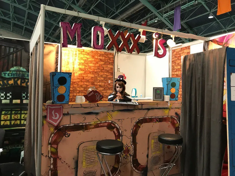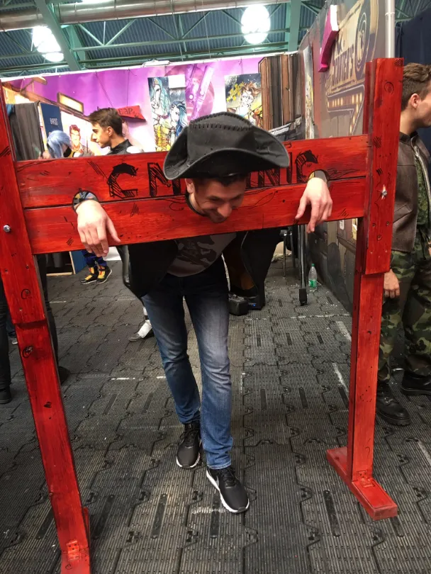Самое интересное было в Borderlands. Дерзкий парень, в костюме Красавчика Джека, сходу предложил мне три способа получения заветной наклейки: сыграть в карточную игру, рулетку или дуэль на пистолетах. Я, будучи мастером игры в Wild Gunman, не задумываясь выбрал дуэль на пистолетах. И вот, мы встали друг напротив друга, как в хороших вестернах. Меня предупредили, что в случае поражения, я буду помещен в тюремные колодки. Я усмехнулся, поднес палец к рукоятке пистолета и стал ждать начала отсчета. Один... два... три... стреляем. Разумеется, матерый герой Borderlands оказался чуть быстрее меня. Следующее что я помню, это слова: «Поздравляю, теперь ты чмошник!» и колодки закрываются на моей шее и запястьях, а на голову мне надевают шапку «чмошника». И все косплееры стенда Borderlands начинают скандировать: «Чмооошник!Чмооошник!». На самом деле, выглядело это не так унизительно как звучит. Мне сказали, что меня выпустят, только когда другой «счастливчик» проиграет одно из заданий. Я ждал. Чуть позже ко мне подошел парень в костюме Иисуса. Я попросил его, чтобы он меня спас, на что тот равнодушно ответил: «Я чмошников не спасаю», а затем достал пистолет из-за пазухи и милосердно выстрелил мне в голову. Миленько у них там, на Пандоре. Но вскоре нашелся новый «чмошник» и меня благополучно освободили, вручив заветную наклейку.