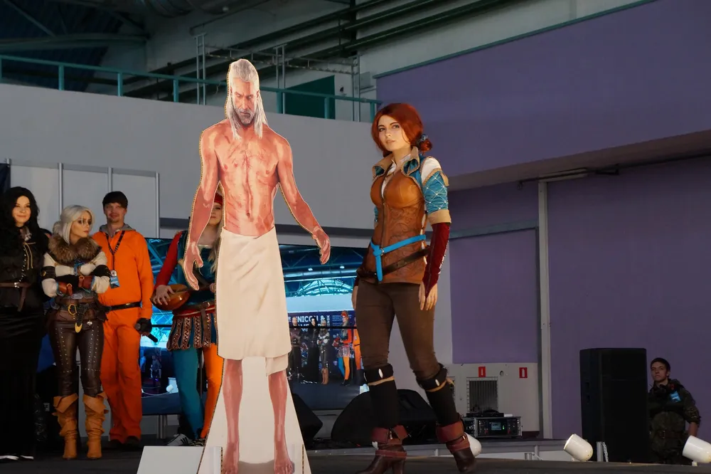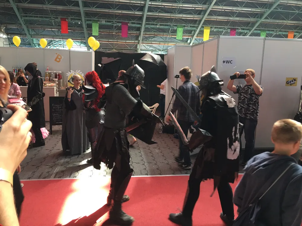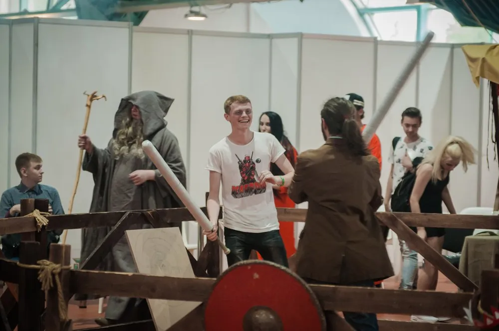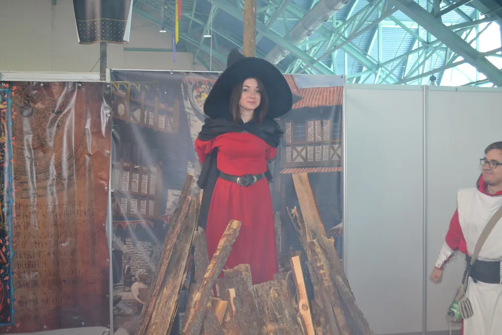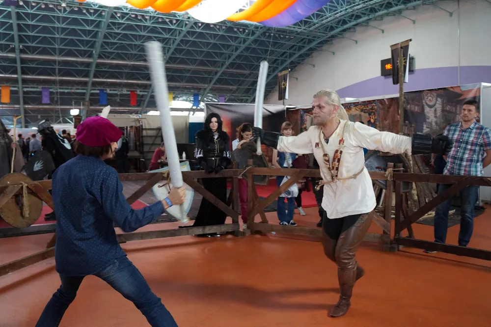 В первый день (то есть в субботу) я, грубо говоря, осматривался. На сцене ведущие устраивали разнообразные «движи», чтобы «раскачать» народ и вовлекать их во всевозможные конкурсы. Возле сцены я много времени не проводил, посмотрел лишь одну часть парада косплееров. Времени на все катастрофически не хватало - даже двух дней было недостаточно. Успел посетить две конференции и просмотреть все имеющиеся стенды. Стенд по Ведьмаку произвел положительное впечатление. Мало того, что у них были внушительные косплееры, убранство, погружающее во вселенную, так они еще проводили турнир по фехтования на мечах. Разумеется, мечи бутафорские, но победа была настоящая. Победитель турнира получил в награду настоящий меч. А еще на стенде Ведьмака можно было сжечь чародейку! Или свою пассию. Вот так вот.