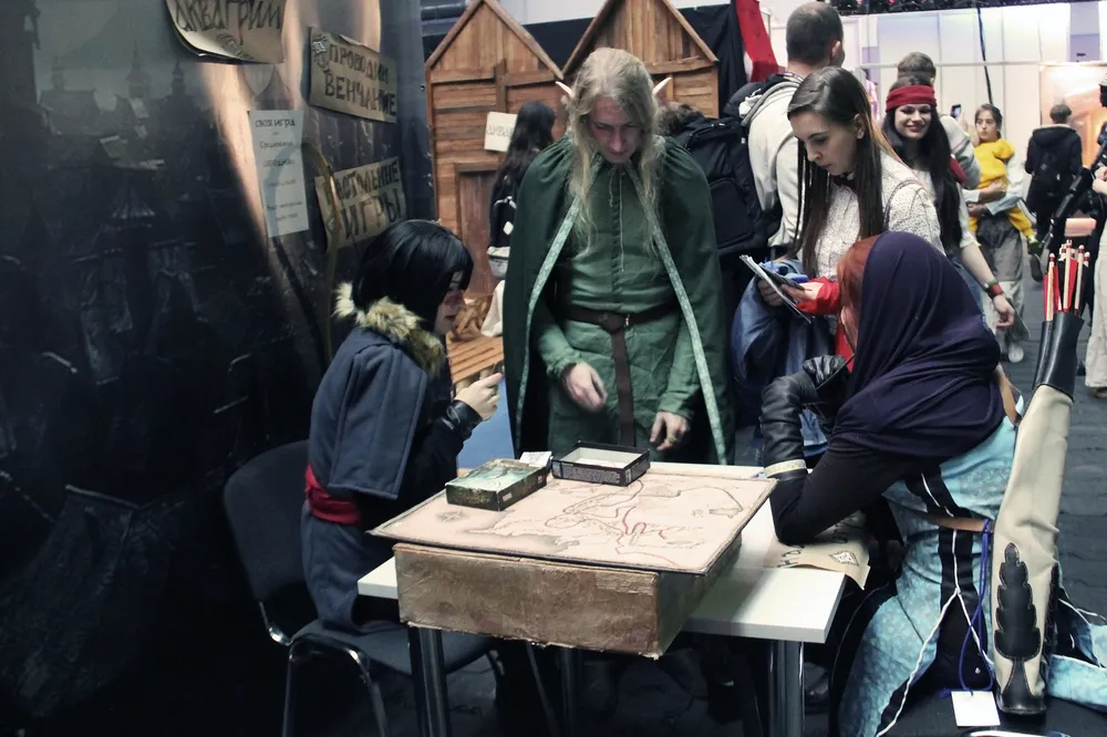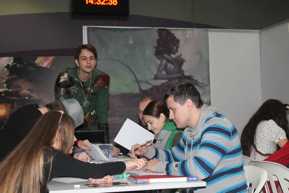 Куратор быстро объяснил правила и дал на выбор колоды карт. Честно говоря, правила я не запомнил. Единственное что я помню, мне досталась раса пиратов и динозавров. Гремучая смесь, как мне кажется. Тут же выяснилось, что никто из играющих правила в принципе не запомнил, поэтому мы разложили карты для вида и сообщили куратору, что успешно завершили партию, чтобы побыстрее получить заветные наклейки. Мы с другом встали из-за стола и поспешили к стенду Dungeon & Dragons.