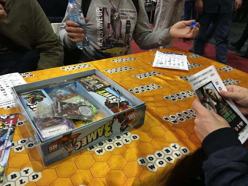 Наконец-то мы дошли до большого стенда Hobby World. Это одно из крупнейших издательств настольных игр. Нас с ходу посадили за стол - играть в карточную игру "Замес" с двумя подростками.