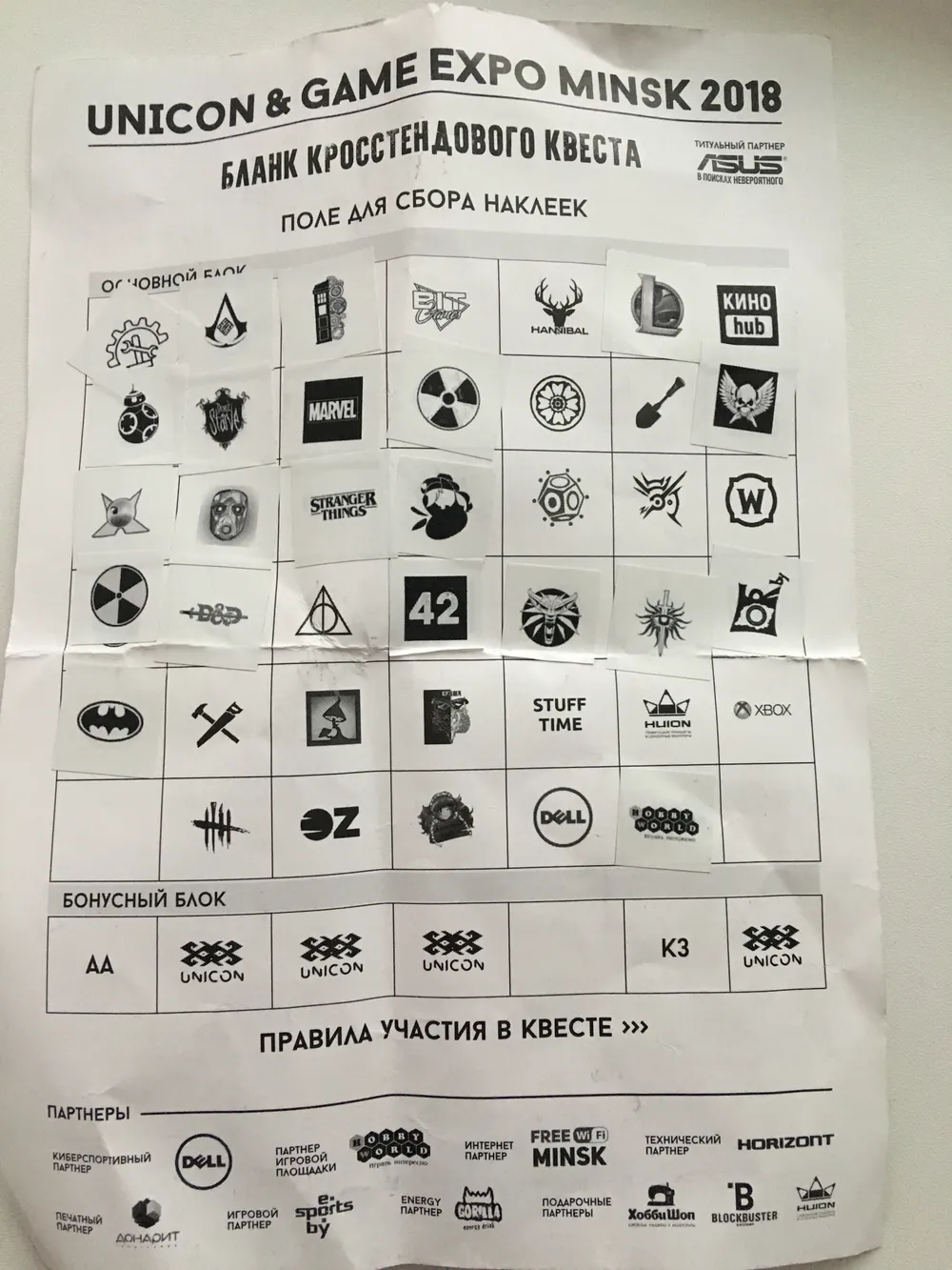 Поясню: на фестивале проходил большой квест с розыгрышем призов и каждый мог поучаствовать в нем. Тебе выдавали бланк, на котором было изображено сорок символов стендов-участников и для каждого символа нужно было получить наклейку у соответствующего стенда. Но наклейку тебе не давали просто так, сперва нужно было выполнить определенное задание. А задания эти ооочень сильно различались. Кто-то предлагал отгадать загадки или поучаствовать в викторине, кто-то задавал вопросы по знаниям вселенной, где-то нужно было приседать или отжиматься, были стенды с логическими заданиями или масштабным приключением.