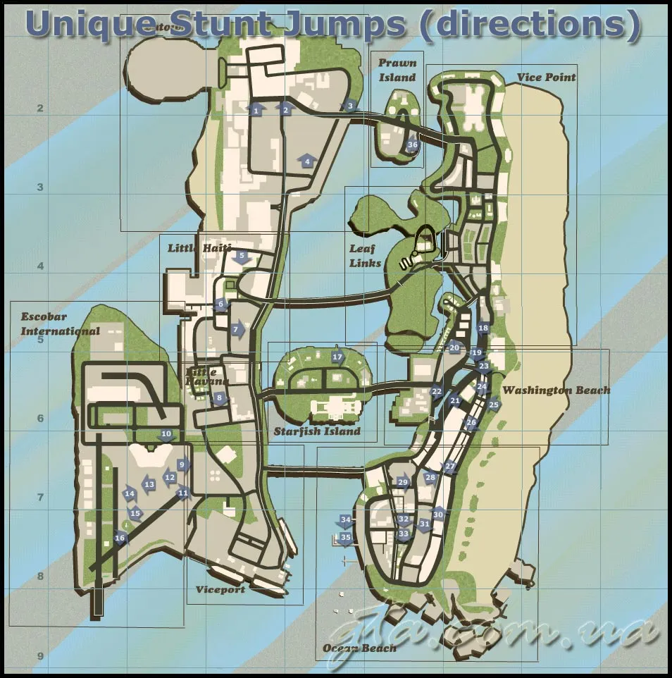 Как известно, в GTA: Vice City присутствуют так называемые "Бонусы уникальные прыжков" (unique stunt bonus), за выполнение которых игрок получает весьма скромную сумму денег и немного приближается заветному прохождению на 100% в статистике. Ниже приведена карта, любезно позаимствованная у ресурса gta.com.ua, на которой обозначены все 36 прыжков и их направления. Настоятельно рекомендуется выполнять прыжки на мотоцикле PCG 600, многие из них можно пройти только этом агрегате.