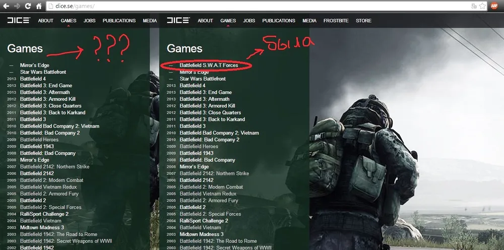 Ранее на странице игр официального сайта DICE была замечена игра Battlefield S.W.A.T, но, потом каким-то странным образом она исчезла из этого списка. Что это значит, да еще в свете последних событий и о чем это говорит, остается только гадать!?
