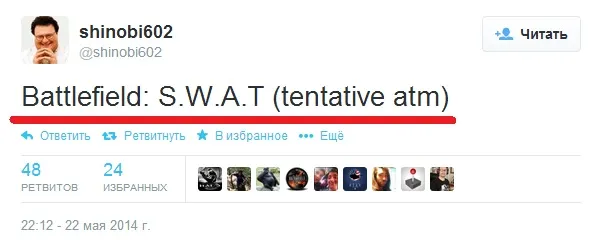 На Е3 будет представлен новый Battlefield с подзаголовком к игре S.W.A.T. Эту информацию распространил известный инсайдер Shinobi602, который очень славится своими данными по утечкам в игровой индустрии. Так в частности он первым опубликовал информацию о предстоящей разработке и выходе следующего Halo 5. И теперь, если верить очередному слуху, можно с относительной уверенностью утверждать, что ЕА на Е3 2014 представит все же новую игру в серии Battlefield. Также известно, что разработкой игры занимается студия Visceral Games (бывшая Redwood Shores), которая ранее разрабатывала игры из серии Dead Space и они же ей принесли наибольшую популярность, а еще помогала DICE делать последнее дополнение End Game для Battlefield 3.
