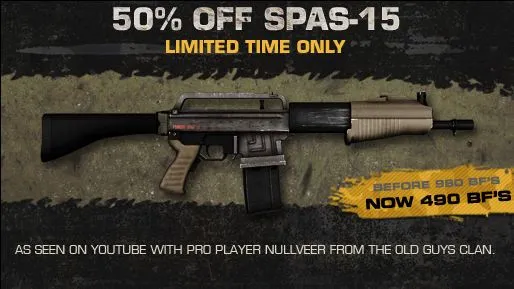 Если вы поклонник мощных "пушек" то это предложение точно для вас. Отличный дробовик SPAS-15 всего за пол цены (490Bf против стандартных 980). Торопитесь, акция ограничена по времени!