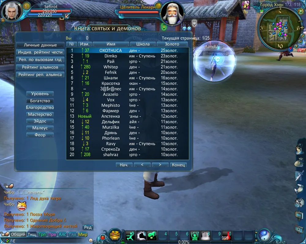 Небольшое отступление – в процессе перемещения по городу мне встретилось огромное количество персонажей, просто стоящих внутри сияющей сферы и явно находящихся «afk». Заинтересовавшись, я спросил в чат – а что это собственно такое? Как выяснилось, сияющая сфера появляется вокруг медитирующего игрока. Медитация – это такая полезная штука, позволяющая быстро восстанавливаться и меееееедленно получать при это опыт. Теоретически, за пару-тройку месяцев непрерывной медитации можно круто прокачаться – а вообще медитировать в городе оказалось весьма полезным в перерывах между игрой.