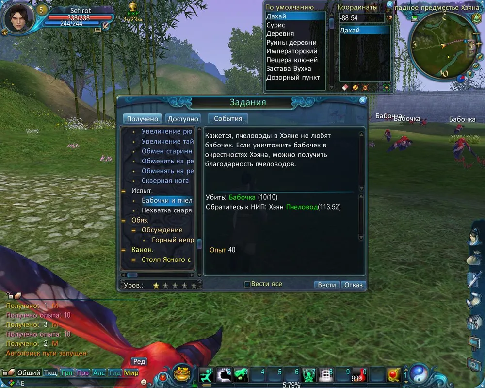 Есть и другой способ выбора объекта, до которого нужно добежать. В окне заданий (открывается кнопкой «Q») просто тыкаем по нужному объекту, и персонаж бежит к нему. Если этим объектом оказывается группа мобов, подлежащих истреблению – автопилот рассчитает путь к месту их наибольшей концентрации. Очень удобно – на автопилоте добегаем до моба, с помощью встроенного бота, о котором я расскажу чуть позже, истребляем их, и опять же на автопилоте возвращаемся обратно. Долой занудный грайнд тысяч мобов – даешь ненавязчивую прокачку с попкорном и просмотром футбола :)