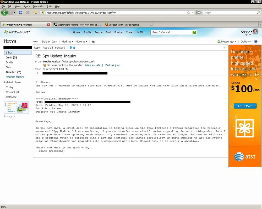 Один фанат TF2, Dr. Bobcat, написал письмо Робину Волкеру, в котором задал несколько вопросов о новом оружии Шпиона. Робин ответил, что у Шпиона будет три устройства для невидимости: стандартные часы, "Звон смерти" и "Невидимый кинжал". Игроки смогут выбрать лишь одно из них.