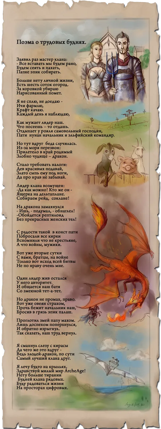 Работы, присланные на конкурс «Мастер рифмы», доказали, что таланта будущим покорителям двух континентов не занимать. Продемонстрировав безукоризненное знание истории мира ArcheAge и виртуозное владение словом, эти самоотверженные люди не обошли своим вниманием все аспекты игры. Победителям поэтического конкурса достались не только отличные награды, но и приглашения на ЗБТ проекта. Узнайте больше о волшебной вселенной ArcheAge, прочитав замечательные стихотворения призеров: