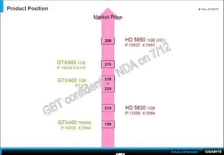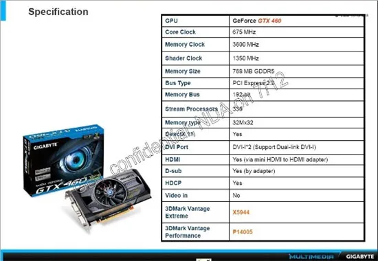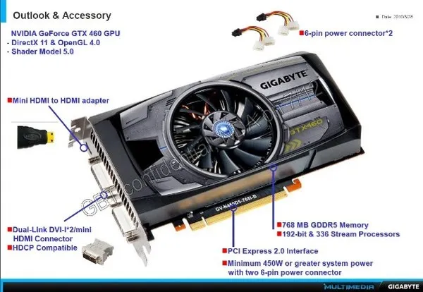 Еще до официального представления видеокарты GeForce GTX 465 нам удалось познакомиться с ее производительностью благодаря слайдам компании Gigabyte. Данные о технических характеристиках модели GV-N465UD-1GI оказались корректными. Другими словами, когда мы обнаружили на страницах китайского форума подобные слайды Gigabyte, но уже касающиеся GeForce GTX 460 768 Мб, сомнений в их правдоподобности не появилось.
