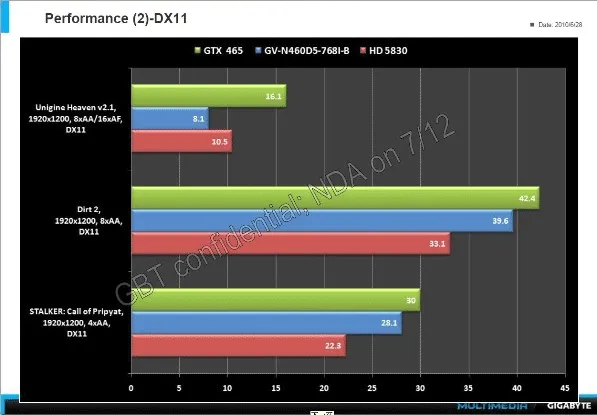 Один из пользователей форума Expreview опубликовал полный обзор GTX 460 768 Мб и слайды по производительности видеокарты. Выходящая 12 июля NVIDIA GeForce GTX 460 768 Мб в среднем немного быстрее, чем ATI Radeon HD 5830 и чуть медленнее GTX 465.