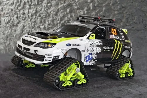 Раллийный гонщик Кен Блок настолько вжился в интерьер Subaru Impreza WRX STI, что заказал у компании Vermont SportsCar что-то совершенно невероятное на базе этого автомобиля. Специалисты взяли стандартную Impreza WRX STI, увеличили мощность двигателя до 400 лошадиных сил, усилили подвеску, дополнили кузов внутренним каркасом безопасности, поставили новые спортивные кресла-ковши, установили противопожарное оборудование. И самое главное - заменили колеса гусеничным приводом.
