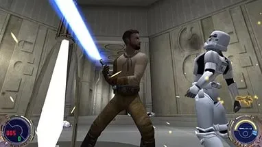Графически и музыкально Star Wars: Jedi Knight II: Jedi Outcast тянет не очень, а в процессе игры могут возникнуть затруднение при разборе с текстурами. Чуть не туда «заряд» направил – и все, пиши - пропало. А попасть в какую-нибудь стену, да в маленькую красную кнопочку достаточно сложно. Но это 2002 год, тогда такие косяки воспринимались почти спокойно, хоть и не красили игру, конечно.