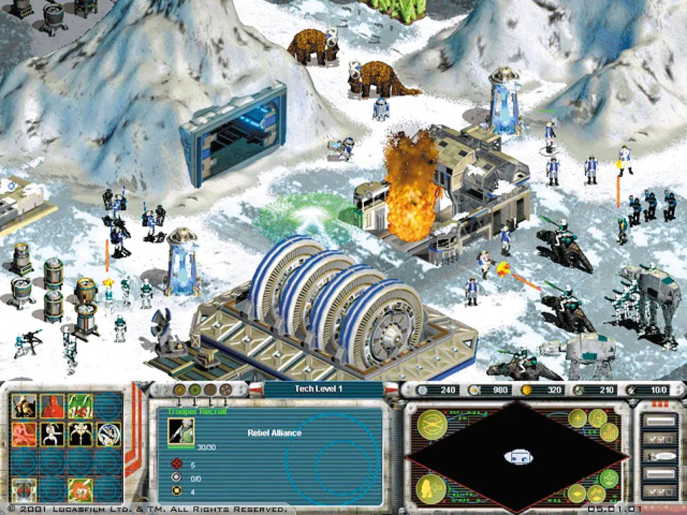Пожалуй, единственная RTS в стилистике Вселенной Лукаса. 6 кампаний, 6 сторон, 6 основных типов ресурсов. На западе игру страшно хвалили: «Идеальная игра для поколения, выросшего на ЗВ». У нас рецензии были более сдержанные: «Здесь нет духа ЗВ!», «это плагиат Age of Empires!»