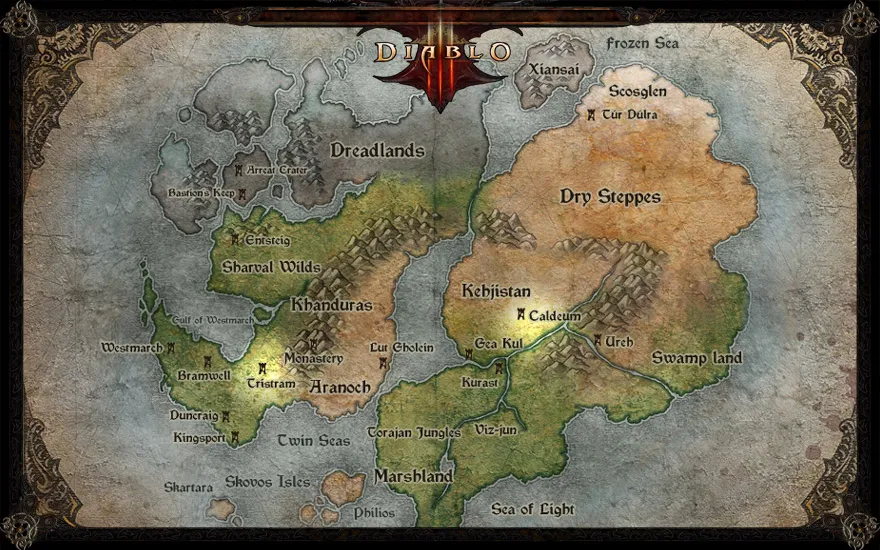 Совершив мощный географический рывок от первой Diablo ко второй, в третьей части игры мир не собирается сдуваться и продолжает радовать фанатов новыми локациями, даже островными. География мира - вообще вопрос отдельный и очень пространный, и на его освещение можно много букв потратить. Поэтому в данном посте я буду писать только об игровых локациях, которые известны на сегодняшний день.